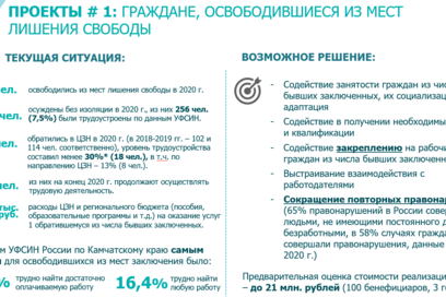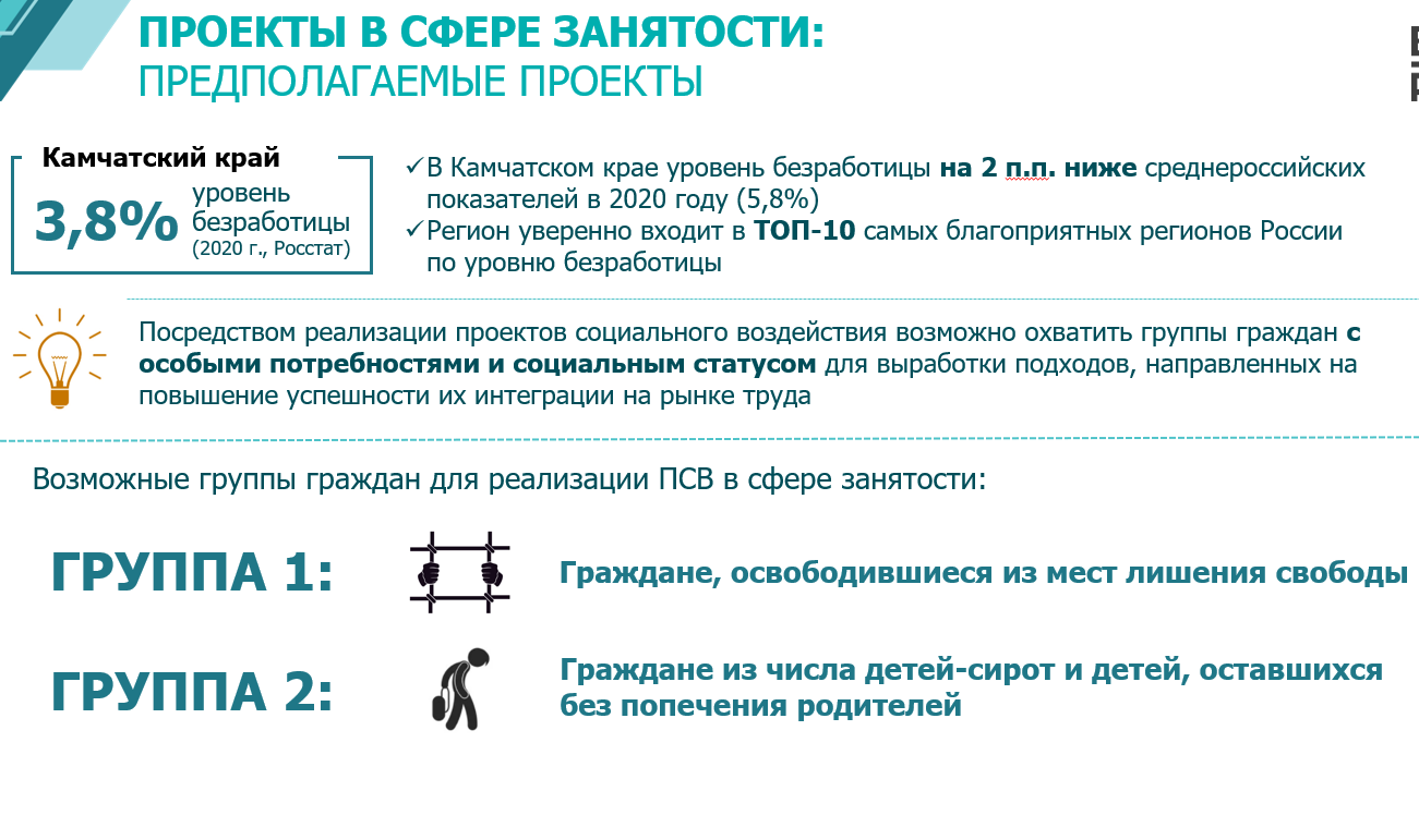 О проекте социального воздействия в сфере занятости, планируемого к реализации в Камчатском крае, сообщила министр труда и развития кадрового потенциала Камчатского края Наталья Ниценко. В качестве социальных бенефициаров согласно проекту предложено определить граждан, освободившихся из мест лишения свободы, и детей-сирот. Выбор данных категорий обусловлен крайне низкой мотивацией к трудоустройству и слабой закрепляемостью на рабочих местах.